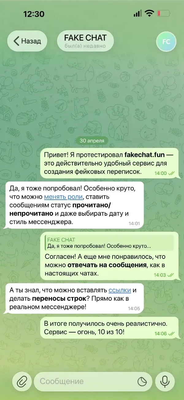 Nuestro generador de chats crea capturas de pantalla falsas de máximo realismo con una alta resolución de 1170×2532. Admite la personalización de todos los elementos de la interfaz, creación de capturas en video y cuenta con un práctico bot de Telegram.
